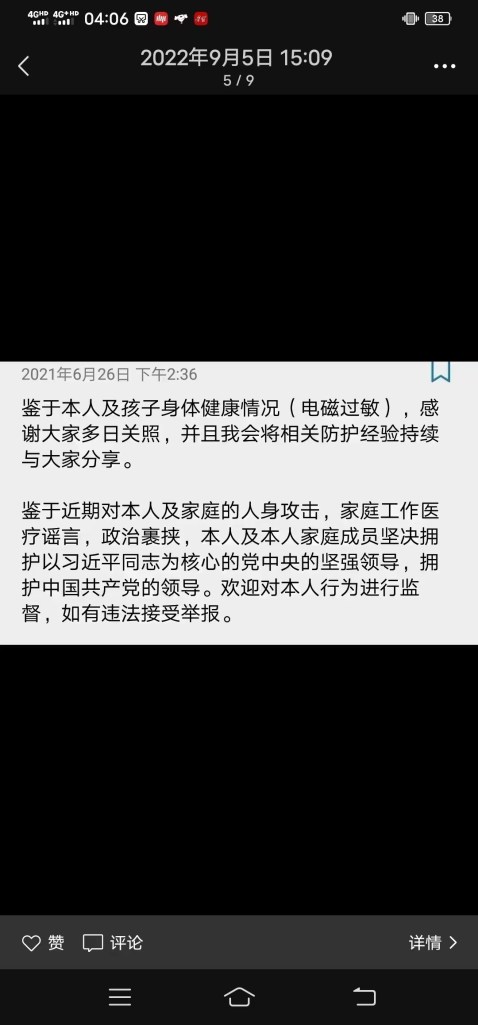 5)2021年4月4日开始在本人微信进行了辟谣,”本人郑重声明,本人从未接受捕获思维人声(脑电广播)任何帮助,并且正在举报之中。”