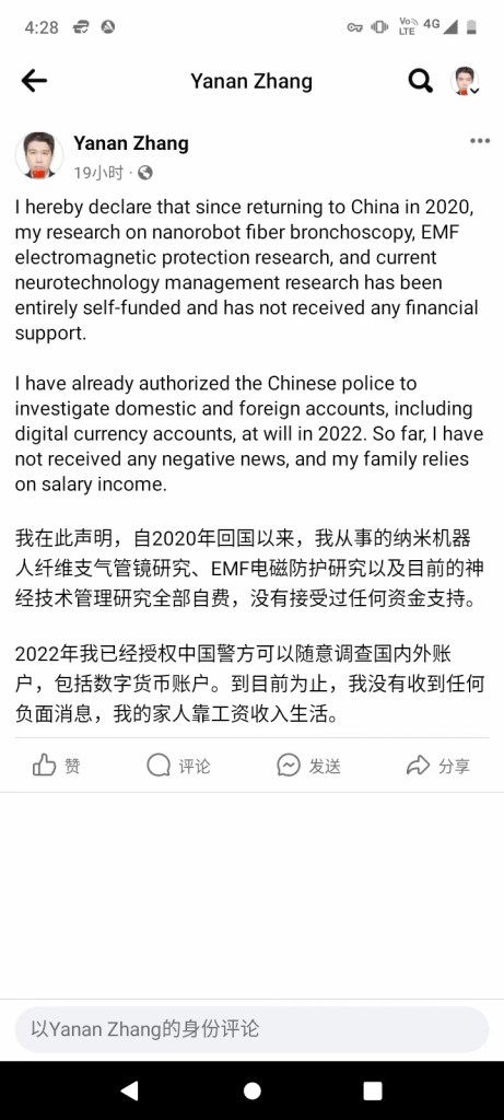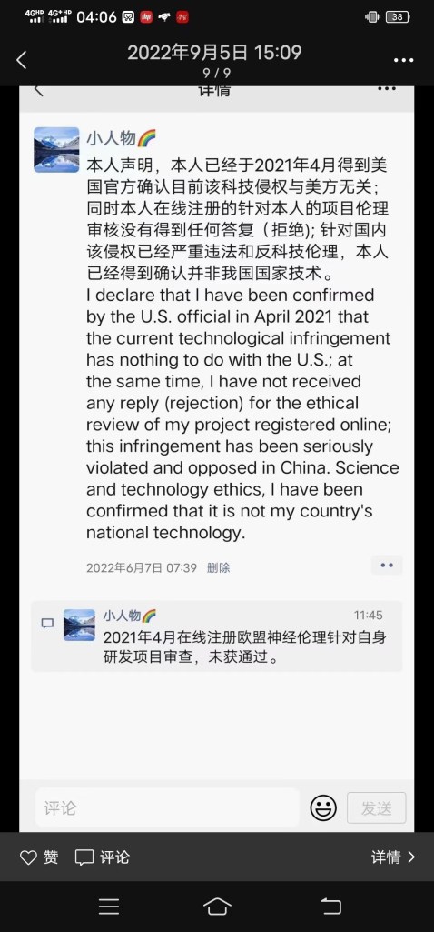 80)微信朋友圈和博客,2025年2月关于本人涉外关系的声明“关于本人与国际友好关系因神经技术制造的曝光和谣言,本人皆以向政府和警方备案接受监控,随时可以接受审查,同时在相关社交媒体均有类似的提示声明,请社会不要被相关谣言欺骗。”