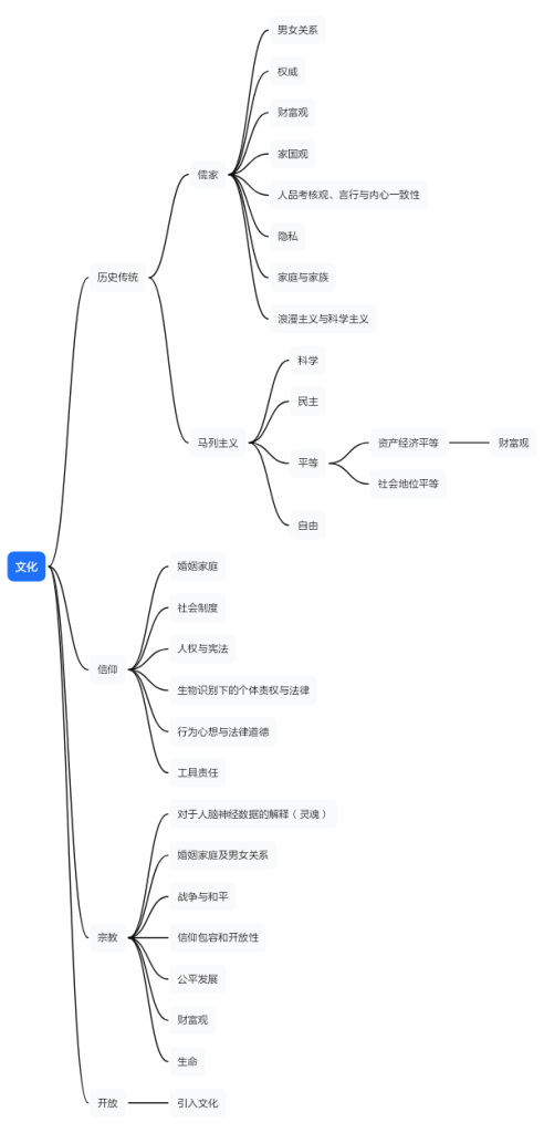 文化总体上是一种科技创新的制约因素,也就是说任何涉及社会学的科技创新都远比纯商业技术创新要困难的多,这个方面直接涉及伦理道德文化的神经技术更是如此。在整个文化压制中,主要的因素是历史传统文化,包含了儒家文化(男女关系、权威文化、财富观、家国观、人品观和内心行为观),马列主义革命文化中(科学、民主、平等、自由、源于经济平等的财富观)。其他信仰、宗教、以及开放过程中引入的外来文化仅仅起到的次要作用,甚至可以忽视。