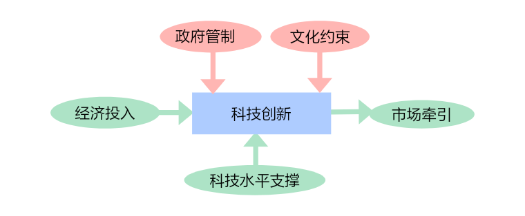 在该模型下共有五种影响因素影响科技创新,其中认为政府管制和文化大体上为约束因素,经济投入、市场需求、科技水平为支撑性的积极因素。当然不否认政府宏观刺激作用,主要体现在税收、宣传、科技投资、知识产权保护;但从治理政策方面应以管制为主,这类将直接影响自由投资市场情绪和期望。