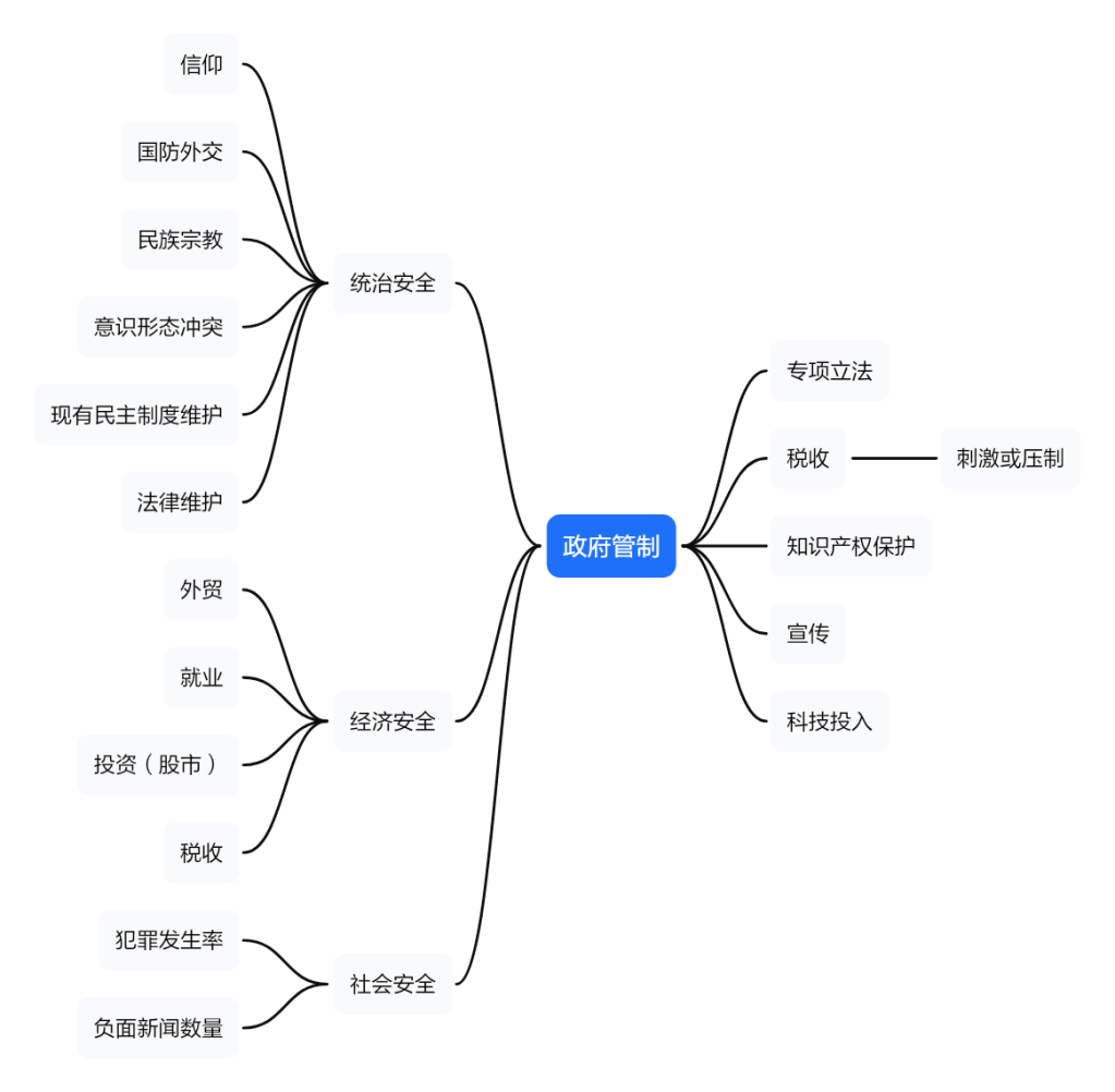 政府管制中左侧为驱动因素,右侧为输出具体措施。作为政府管制的主要驱动因素为政治安全(统治安全)、经济安全、社会安全等因素;输出为专项立法、税收、知识产权保护、宣传、科技投入